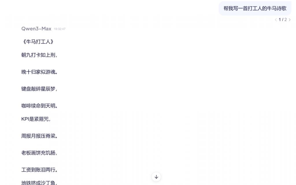 我让它写个 " 打工人诗歌 ",结果直接变成了打油诗,勉强能看。