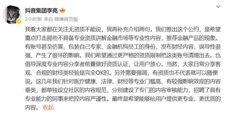 抖音副总裁李亮回应“无资质不能发财经内容”