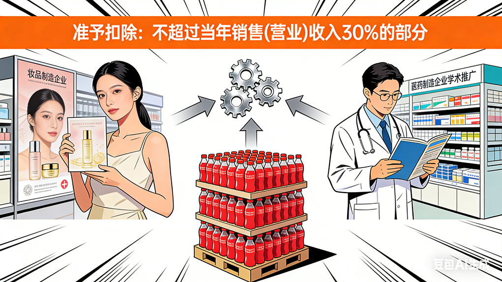 公告宣布,对化妆品制造或销售、医药制造和饮料制造(不含酒类制造)企业发生的广告费和业务宣传费支出,不超过当年销售(营业)收入30%的部分,准予扣除;超过部分,准予在以后纳税年度结转扣除。