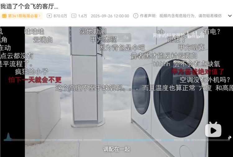 为了让用户对COLMO新品“云璃白”家电有最直观的了解,UP主@神奇阿宇Ayu脑洞大开,直接把客厅搬到2000米高空,在云层中体验“云璃白”电器。该视频不仅登上每周必看榜,屏幕中还不断涌现“甲方爸爸暗喜”等弹幕。