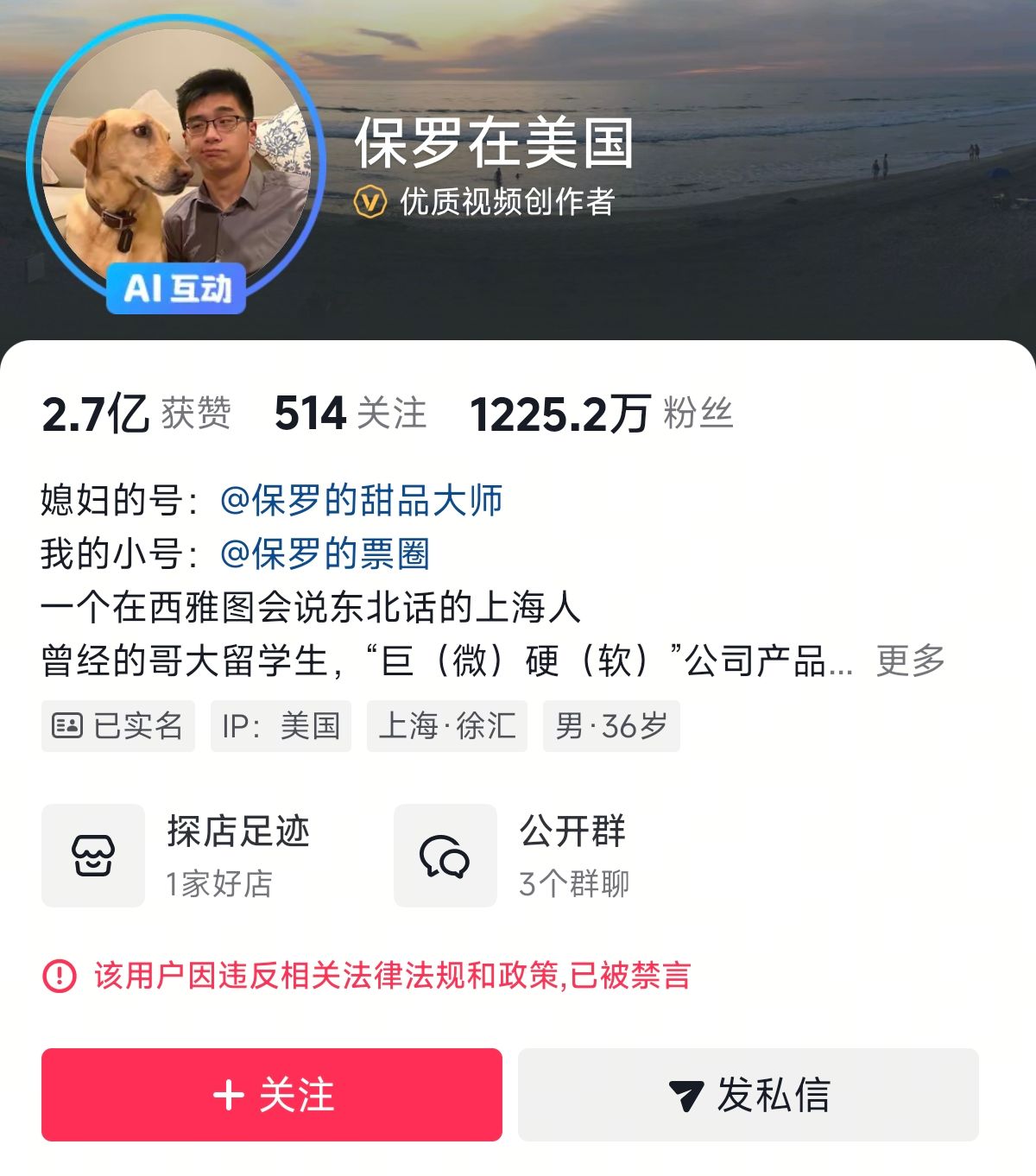 据介绍,保罗毕业于名校,定居西雅图,曾被称为“会说东北话的微软产品经理”,靠说东北话走红。截至2月12日,其账号“保罗在美国”在抖音平台拥有超过1200万粉丝。