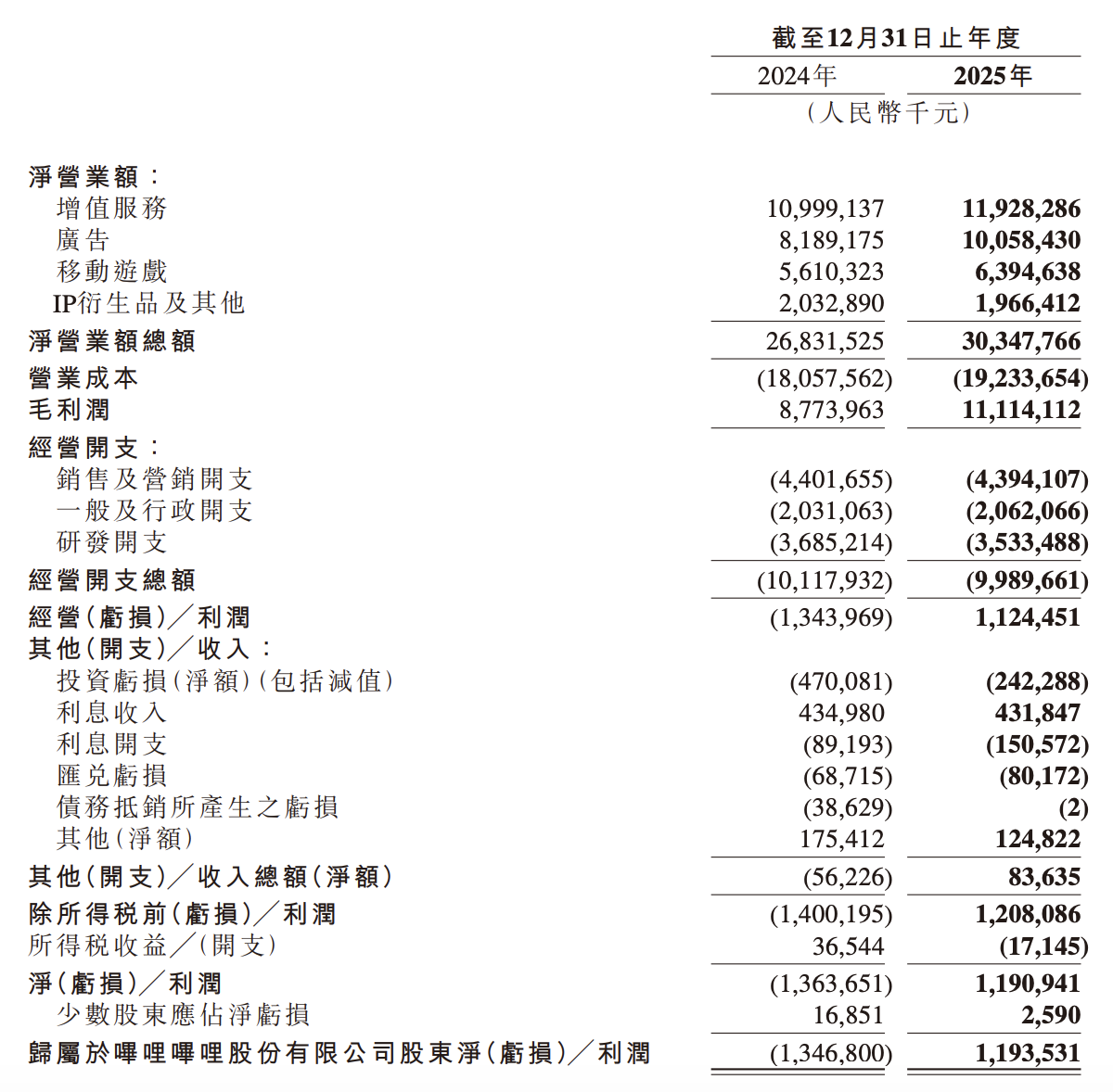 2025年,B站营收为303.5亿元,同比增长13%;净利润为11.9亿元,同比转亏为盈——2024年B站为净亏损13.6亿元。看向第四季度,B站营收为83.2亿元,同比增长8%,净利润为5.1亿元,同比提升478%。