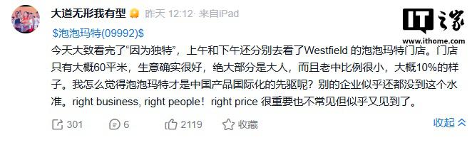 他表示," 今天大致看完了‘因为独特’,上午和下午还分别去看了 Westfield 的泡泡玛特门店。门店只有大概 60 平米,生意确实很好,绝大部分是大人,而且老中比例很小,大概 10% 的样子。我怎么觉得泡泡玛特才是中国产品国际化的先驱呢?别的企业似乎还都没到这个水准。right business, right people!right price 很重要也不常见但似乎又见到了。"