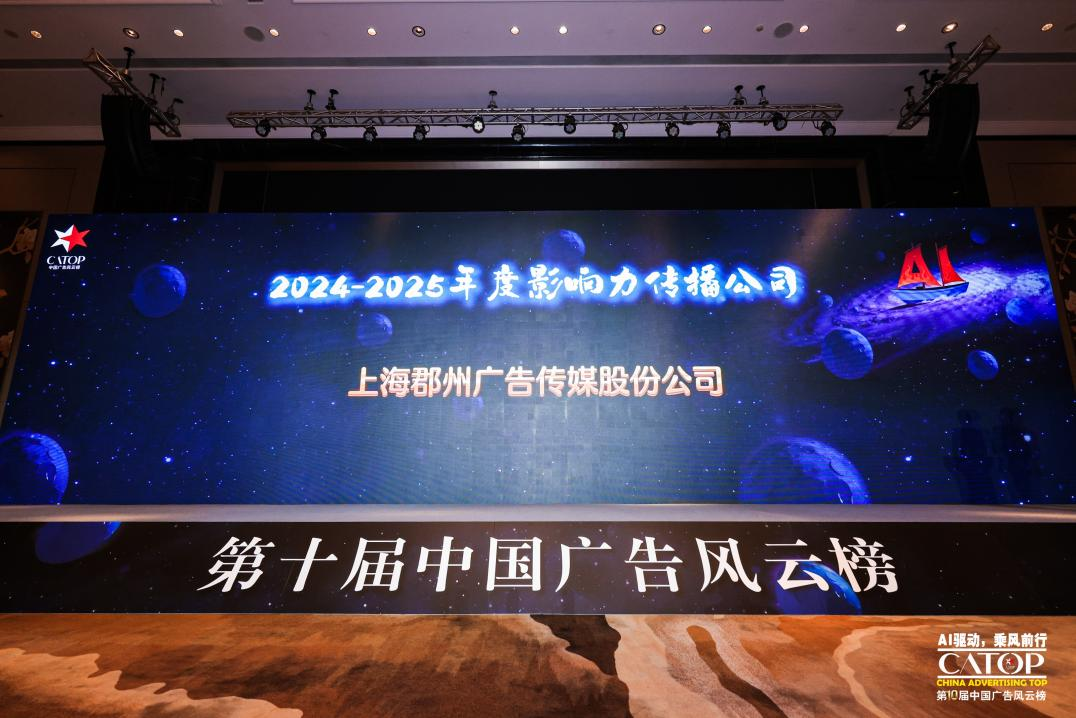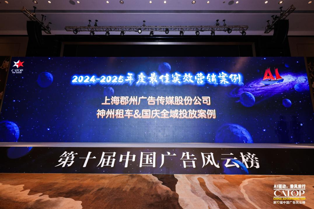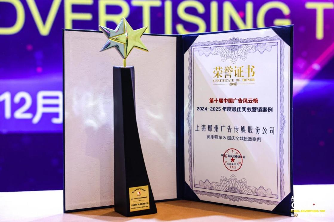 12月5日,第十届中国广告风云榜高峰论坛暨颁奖典礼在长沙圆满落幕。本届大会以“AI驱动 乘风前行”为主题,聚焦生成式AI为行业带来的深刻变革。在这场汇聚顶尖智慧的年度盛事中,上海郡州广告传媒股份有限公司(以下简称:“郡州传媒”)凭借卓越的创新实力与实效成果,一举斩获双项大奖:公司荣膺“2024-2025年度影响力传播公司”,其助力神州租车打造的国庆全域投放案例,更夺得“2024-2025年度最佳实效营销案例”荣誉。